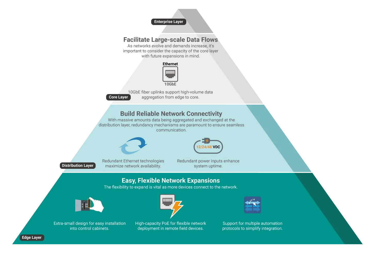 Following our main article "Futureproof Industrial OT with Moxa’s Secure Edge-to-Core Networking" In modern industrial environments, reliable data communication depends on the seamless convergence of networking technologies across multiple layers. Each layer plays a critical role in ensuring efficiency, scalability, and continuous operations.