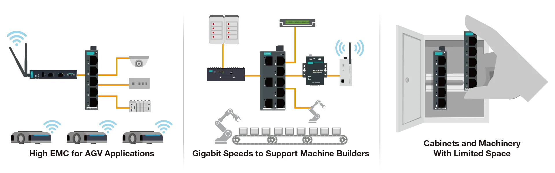 Designed for operation in severe environments such as refrigerated food production, on autonomous guided vehicles (AGVs), or inside production equipment and machine control housings where high-speed and efficient performance are critical, MOXA's unmanaged switch portfolio delivers an affordable means to attain resilient and stable network connectivity for a wide array of industrial uses.