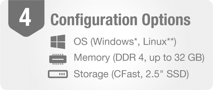 | CFast: 64 GB, 128 GB, 256 GB, 512 GB, 1 TB | 2.5”SSD: 64 GB, 128 GB, 256 GB, 512 GB, 1 TB | ||||