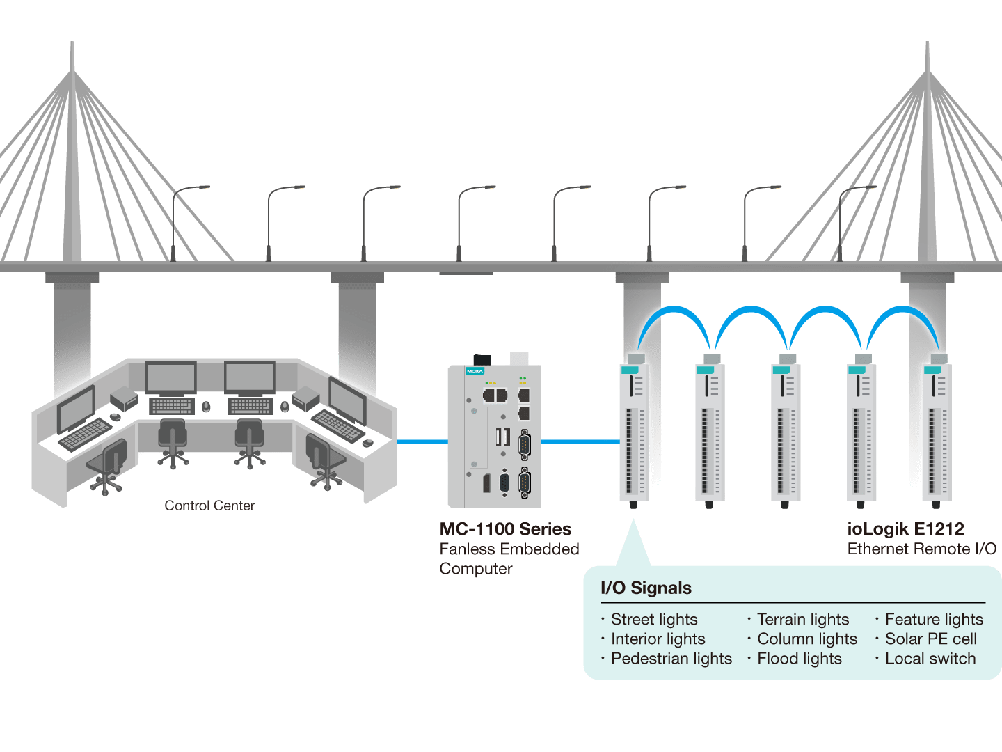 Moxa remote I/Os are providing robust, compact control of lighting, roadside, and field systems across all forms of smart transportation, from tunnels to terminals, with products designed to operate in harsh outdoor environments.
