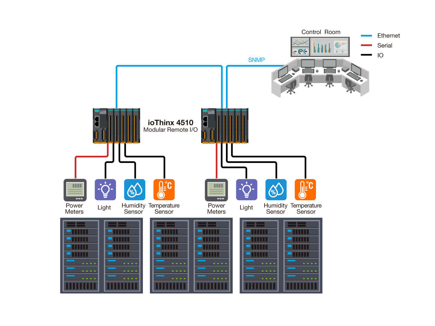 Moxa remote I/Os are great for thermal monitoring, legacy equipment integration, and energy management, as they support Modbus and SNMP protocols to easily connect with IT systems even in limited space.